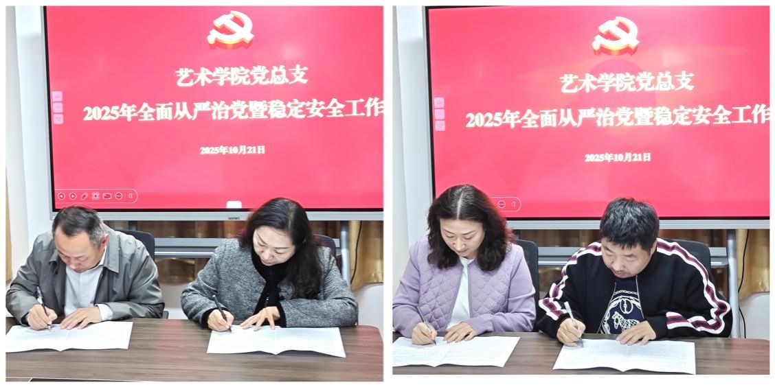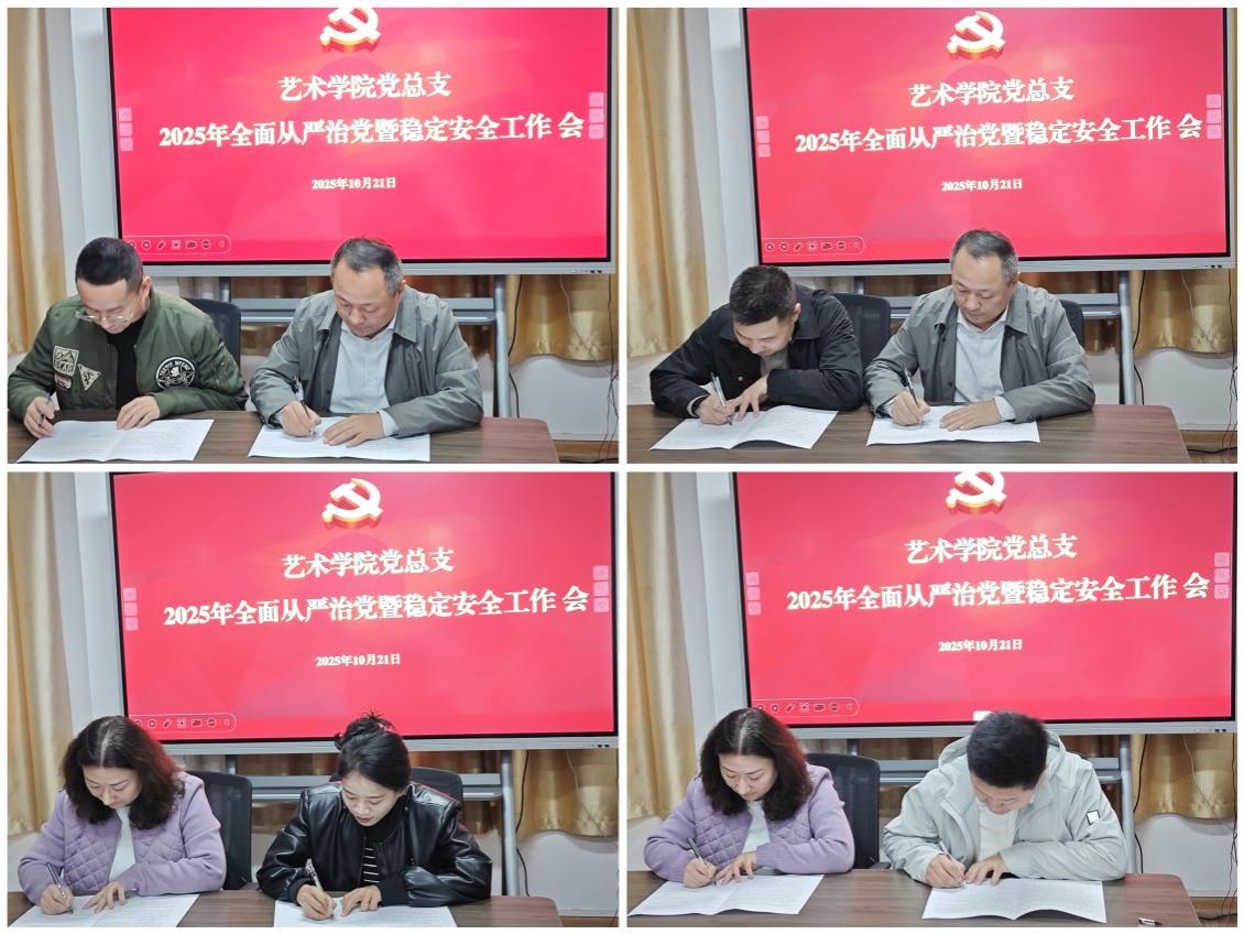 会上,党总支书记、院长分别与党总支副书记、副院长,教师党支部书记、系主任代表、党政办、教学办、学工办等相关负责人签订了《艺术学院2025年全面从严治党工作责任书》、《艺术学院2025年稳定安全工作责任书》。