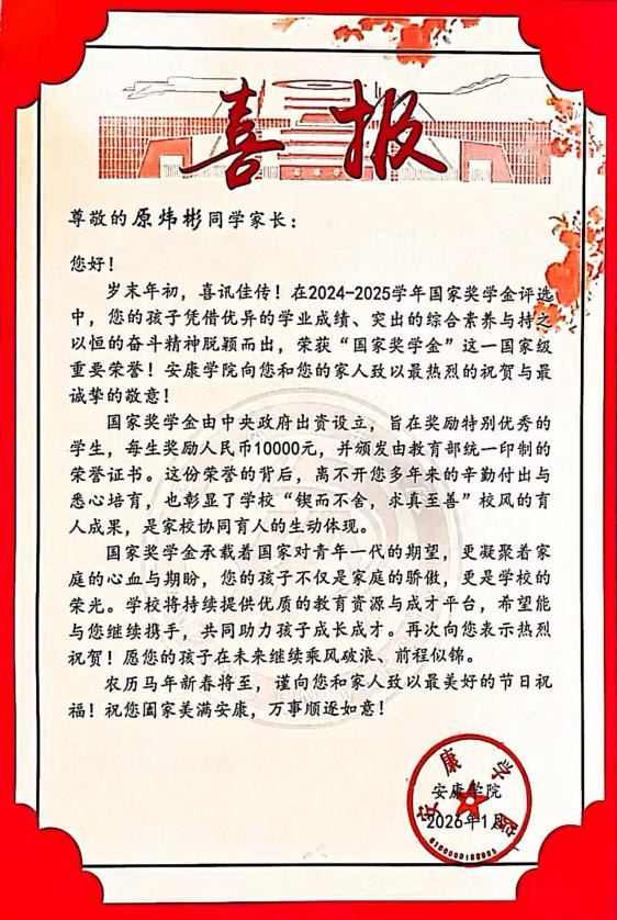 岁末年初捷报传,我院席炳旭、原炜彬两位同学凭借优异的学业成绩、突出的综合素养与持之以恒的奋斗精神,在2024-2025学年国家奖学金评选中脱颖而出,成功斩获这一国家级重要荣誉。