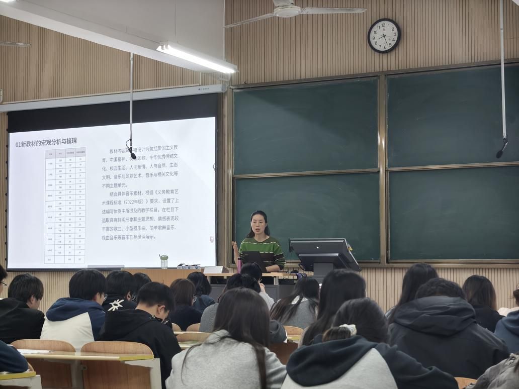 为深化师范生培养模式改革,全面提升音乐学专业学生基础教育音乐教材解读能力与课堂教学实践水平,夯实学生从教核心素养,4 月 13 日晚,艺术学院在江北校区 1404 教室,特邀陕西省教学能手、汉滨区汉滨初中艺体中心副主任刘平老师,为 2023 级音乐学专业 80 名学生开展《音乐教材分析与教学设计》双师教学专题授课,助力学生搭建理论学习与教学实践衔接的高效桥梁。
