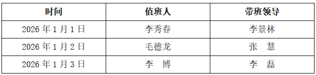 根据学校《关于2026年元旦放假安排的通知》现将“元旦”假期安全稳定及值班安排如下: